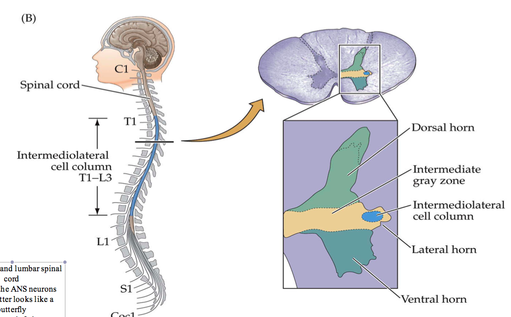 sympathetic trunk= ganglia, in the swelling is where the ganglion cells are pregaglionic= myelinated -postganlionic cells= grey -another group of ganglionics= prevertebral ganglion = goes to the gut -these are usually in the midline of the gut
