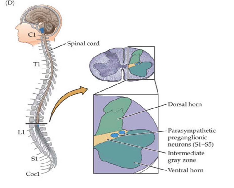 2-sacral spinal cord in=midbrain and medulla