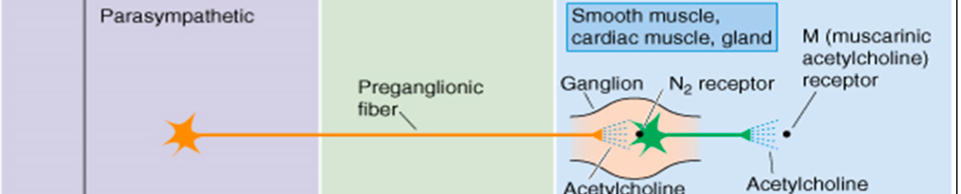 What receptor and neurotransmitter does the parasympathetic nervous system use (both pre and postganglionic)?