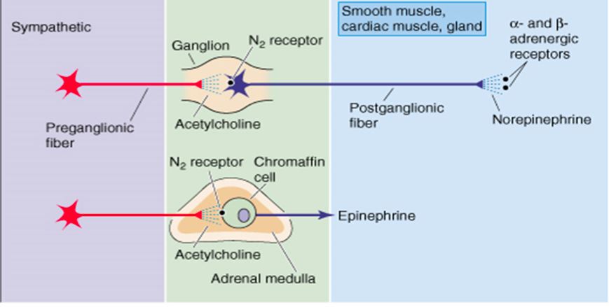 -adrenal medulla= receives input from pre ganglion neuron and releases adrenalin into the circulation -adrenal medulla part of the sympathetic