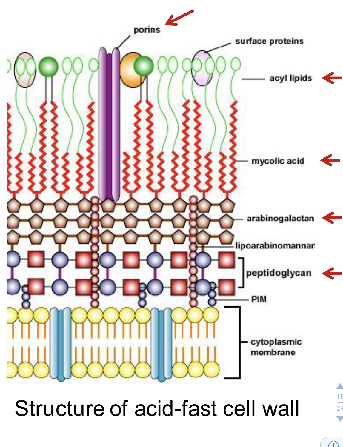 Mycolic acids & other glycolipids also slow down entry of nutrients causing slow growth–> more resistant to antibacterial agents and lysosomal components