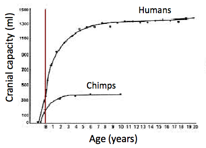 -human much larger -cranial capacity= volume inside the skull -adult chimps- 400ml -adult humans=1400ml -we start at almost the same way but then the difference changes at around 6 months=