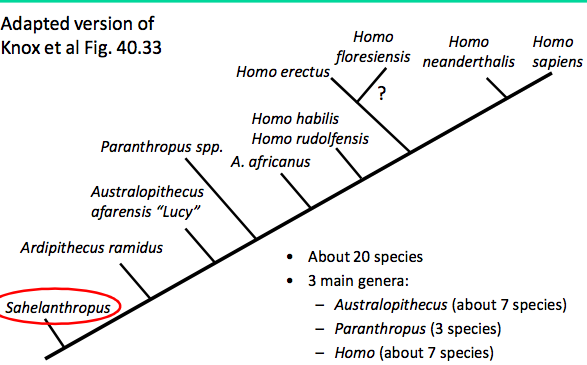 -discovered 2001 in Chad -nicknamed Toumai -6 to 7 million yrs old -chimps and humans may have common ancestor earlier than thought -skull only -location of foramen magnum on base of skull suggests it was bipedal -not certain it is a hominid
