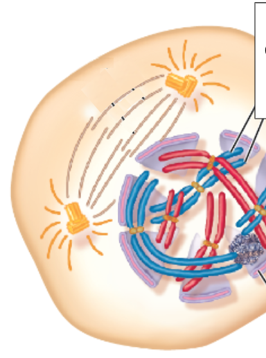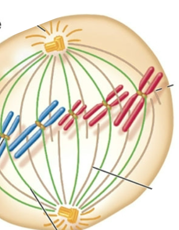 2) Microtubules attach to kinetochores on each side of the chromosome’s centromere. They pull until the chromosomes are aligned in a straight line.