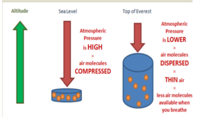atmospheric pressure is lower (weight of air pressing down is less)