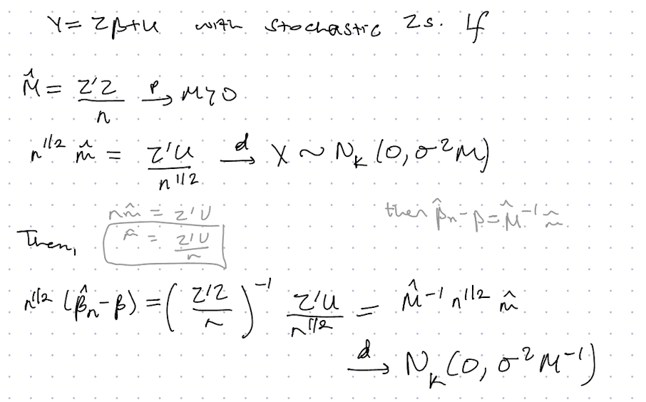 Derive the distributon of n^(1/2)[Beta hat - Beta] with stochastic z’s.