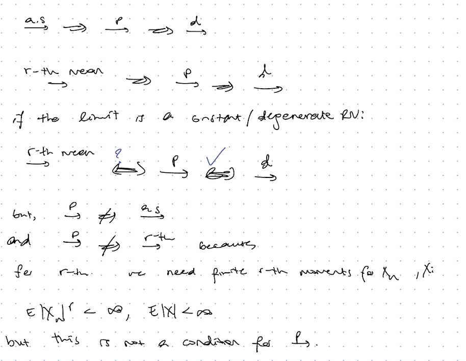 State the relationships between convegence in a.s, p, r-th mean, d.