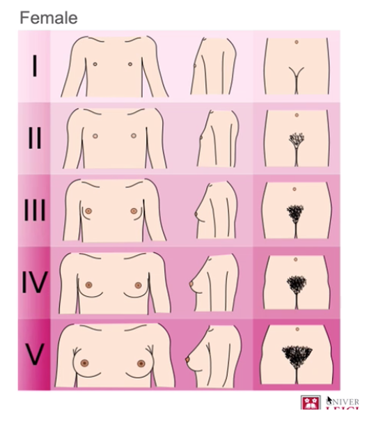 pubic hair- sparse, lightly pigmented, straight, medial border of labia