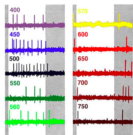 -this pic shows the AP of a P ganglion cels as reacting to different frequencies of light -one ganglion cell, it responds best to one wavaelength= black it is important for carrying info for colour