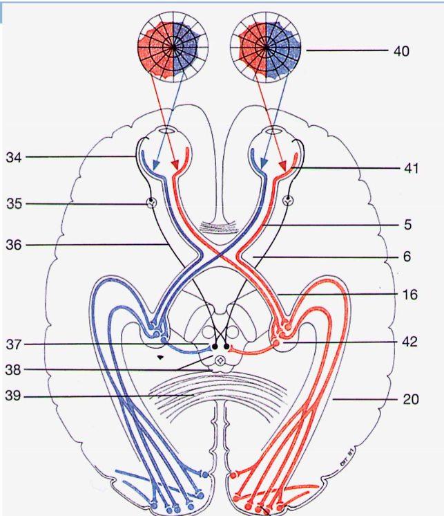 -the nasal fibres cross over -get information from both eyes in each hemisphere -partial crossing of the visual field