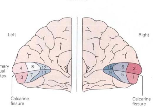 -occipital lobe, around the calcarine fissure (gap) -very far back in the brain -if you cut corpus callosum medially= then there