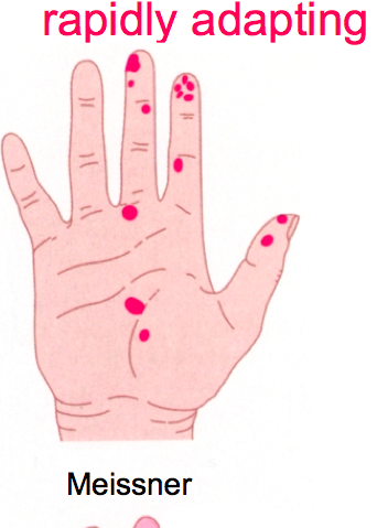 1.Meissner receptors= found near the skin surface and have a transient response to skin movement 2. Pacinian receptors= located deep in the dermis and hypodermis and have a transient response to vibration