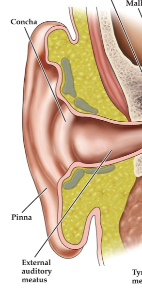 -pinna has functional significance= if sound from in front of you, and same sounding sound from behind you, how do you detect where each comes from?= part of that ambiguity is resolved by pinna= amplify high frequencies from high up -filtering of sounds pina and concha as well