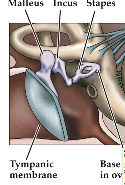-the tympanic membrane and the malleus, incus and stapes translate the vibrations in the air to vibrations in fluid -it is very hard to transmit energy through water(like around lakes how you can hear from far= as the sound is not absorbed by the water!) -the middle ear= mechanical lever system= more energy over a smaller area= makes it easier for energy to get to the fluid