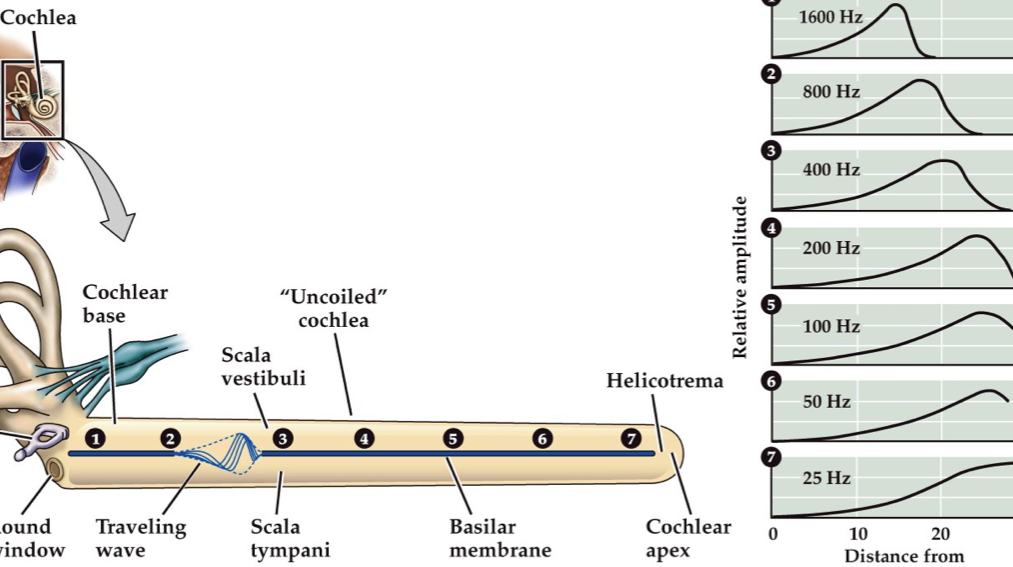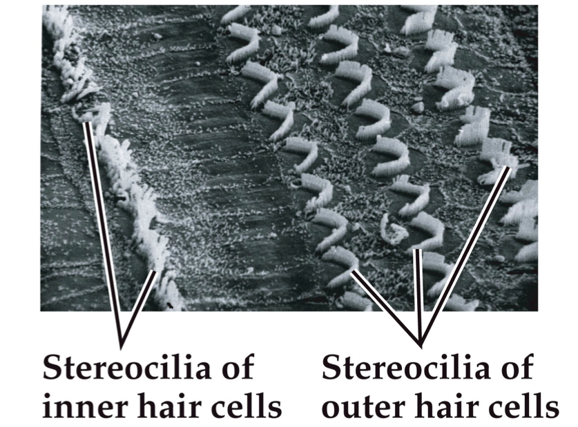 picometers to 100dB (dB= log scale!) (picometers= changes in movement on that scale can lead to detection in auditory system)