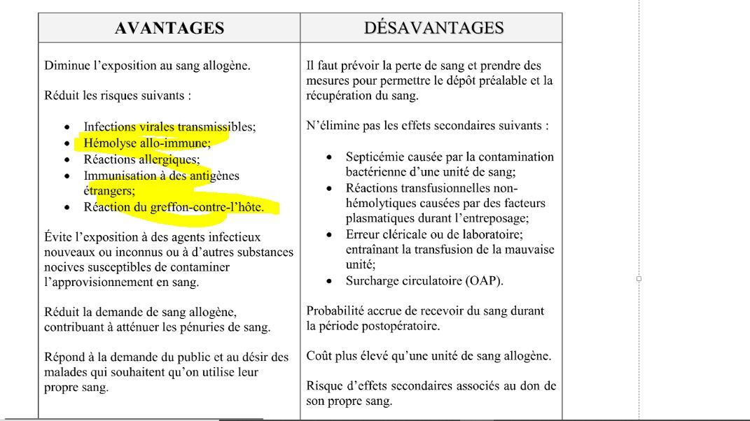 DOnne au moins 3 risques qui sont diminué par l’utilisation d’une transfussion autologue