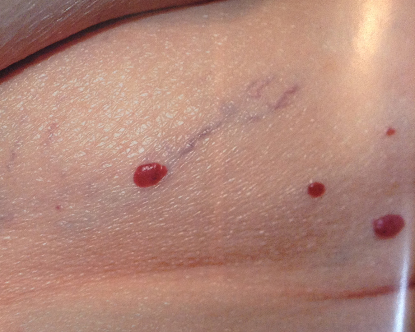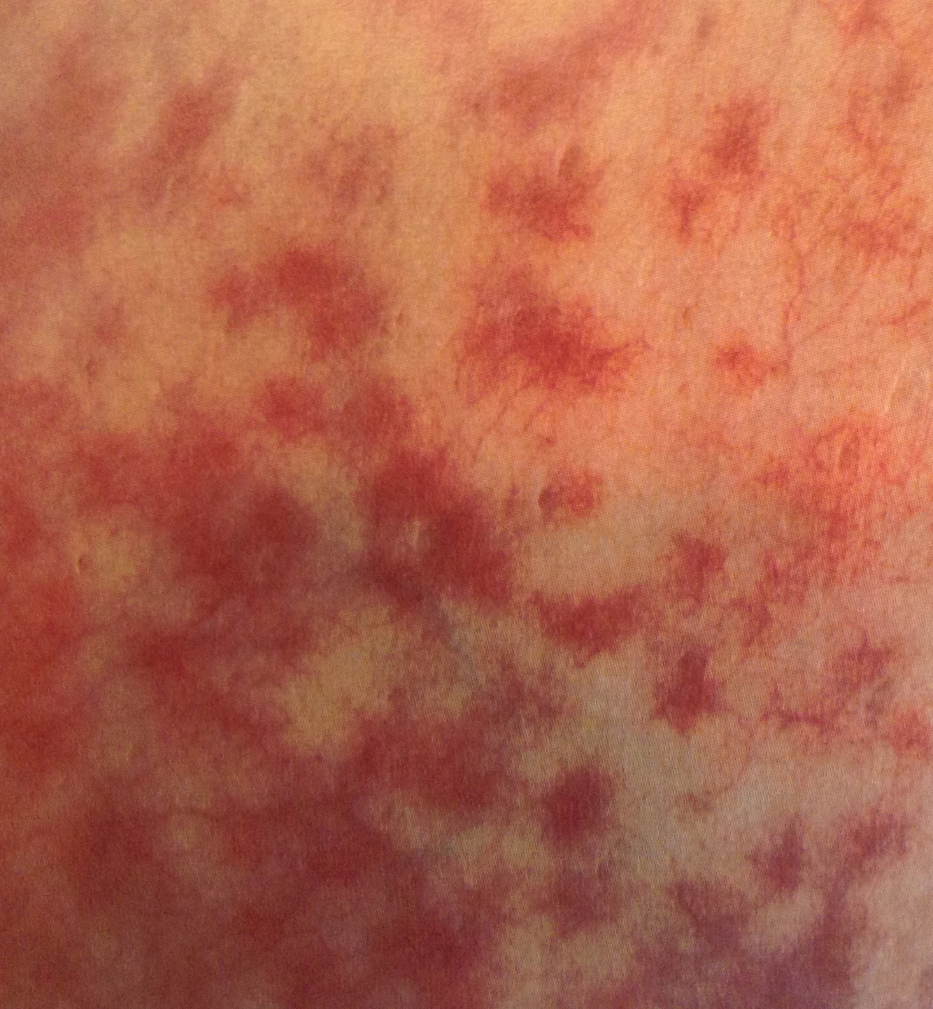 Reddish-purple lesion that is non-blanchable, indicating blood having left the vessels and moving through other tissues
