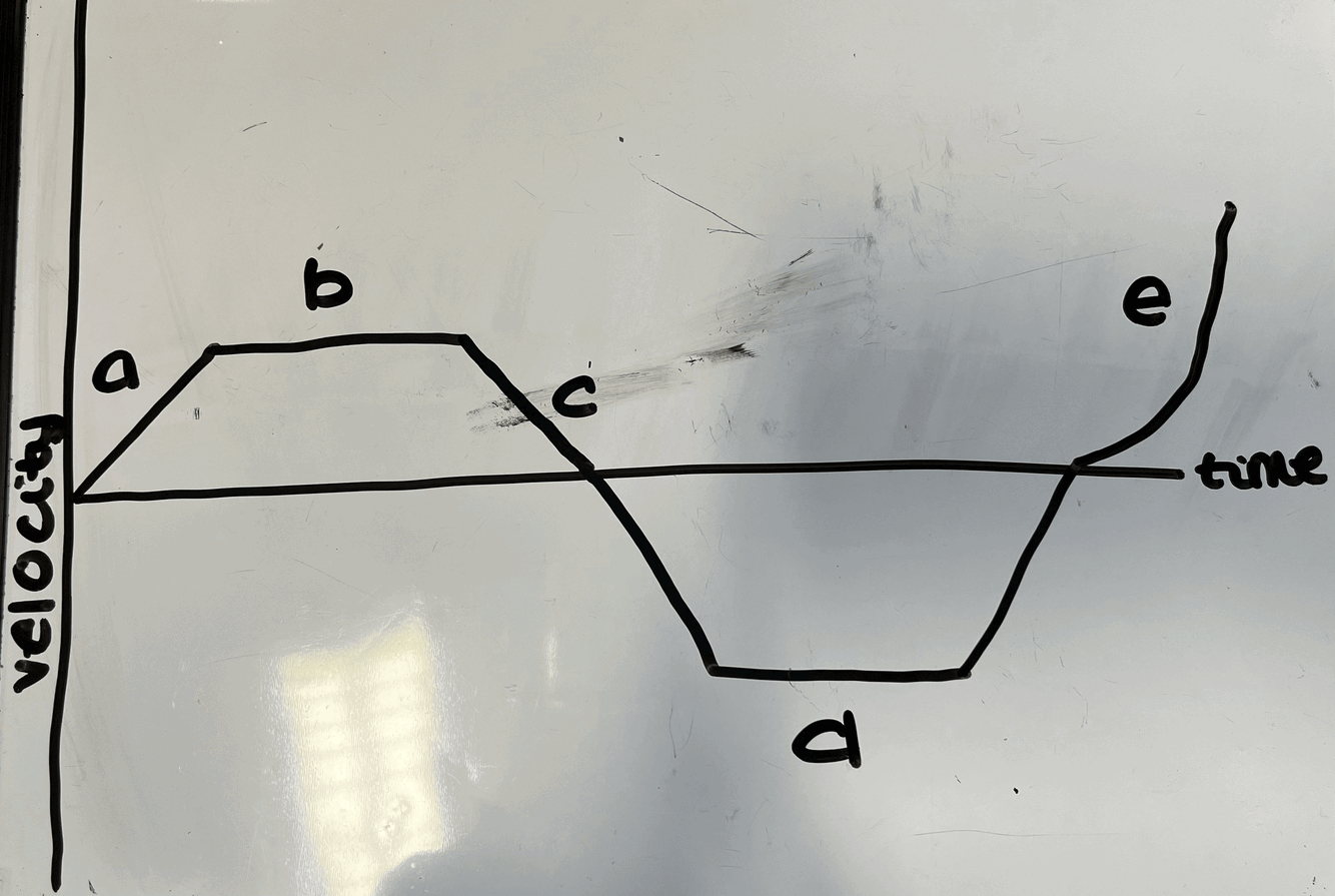 sketch a velocity time graph for acceleration, deceleration, constant speed, increasing acceleration, forward direction, backward direction