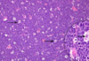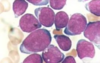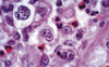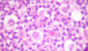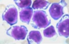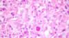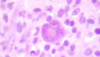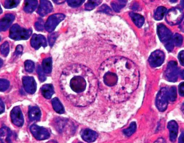 Célula grande binucleada con nucléolos prominentes en ojos de búho.