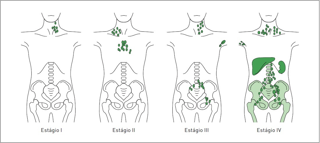 Estágio 1: 1 cadeia ou estrutura linfoide (baço, timo)