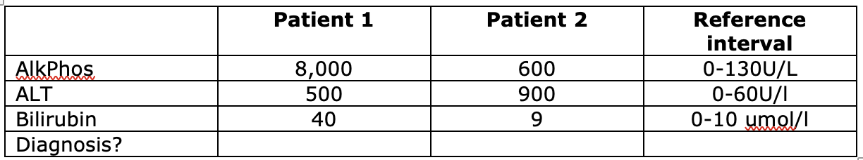 look at the following results. which patient is likely to have a bile duct obstruction and which is more likely to have received a hepatotoxic drug
