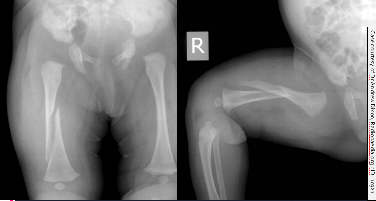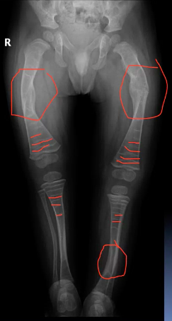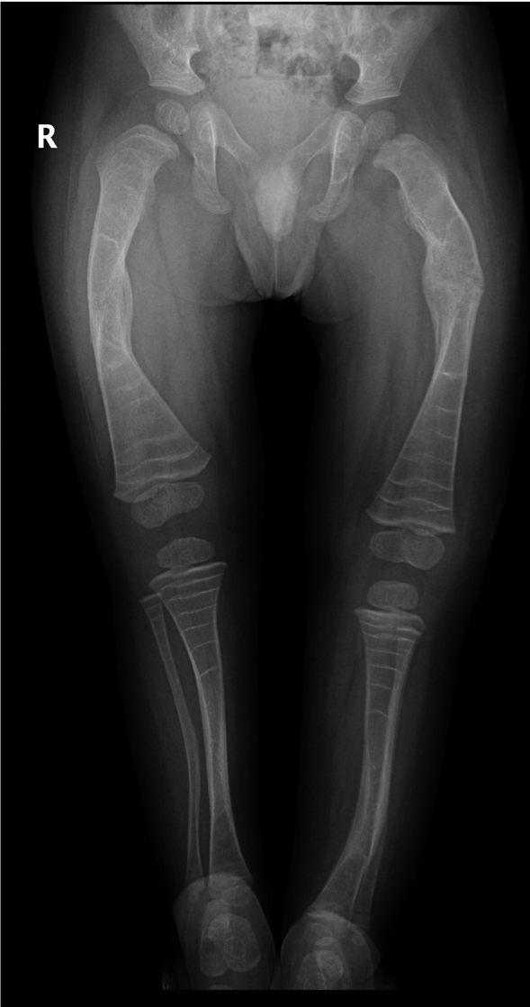 What abnormalities can you see in the X-ray of this child’s lower limb bones?