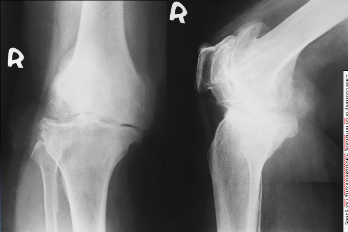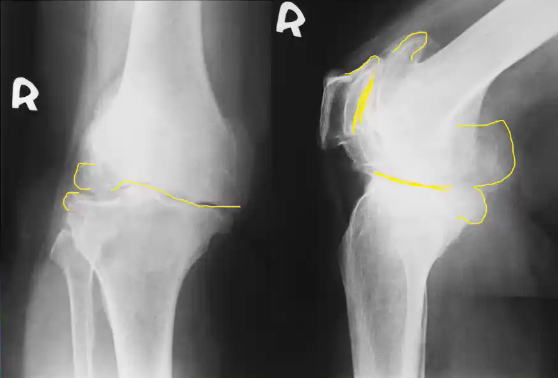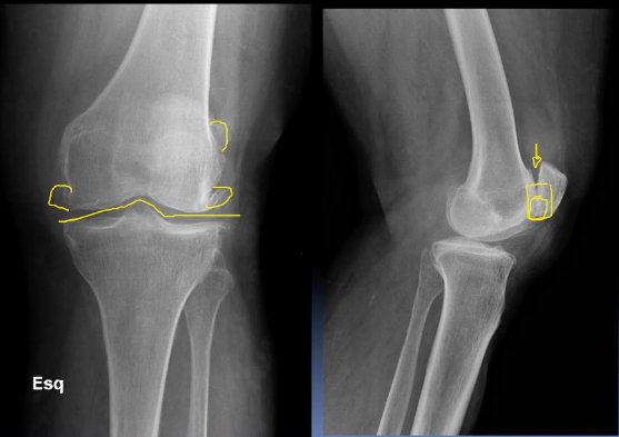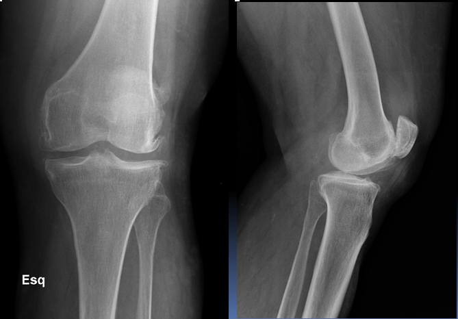 This 75 year old woman presented with difficulty walking and knee pain. How would you describe these X-rays?