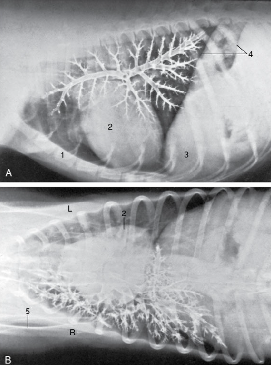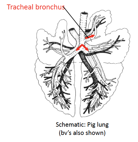 in ruminant and pigs –> cranial to bifurcation –> cranial lobe right lung