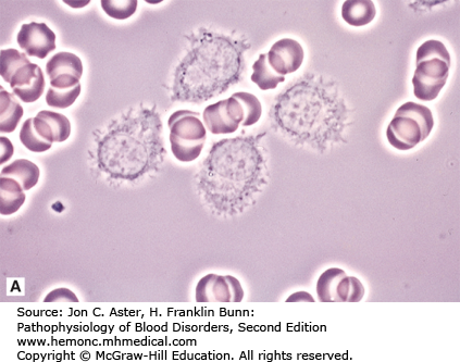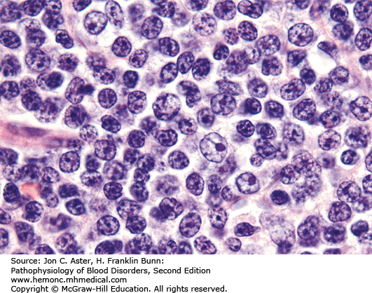 Characterized by overwhelming numbers of small, fragile lymphocytes with packed chromatin and scant cytoplasm either in peripheral blood or in bone marrow, with “proliferation centers” in the lymph nodes. Prolymphocytes are actively dividing cells in proliferation centers have especially large nuclei with very prominent nucleoli. Image of proliferation center is shown below.