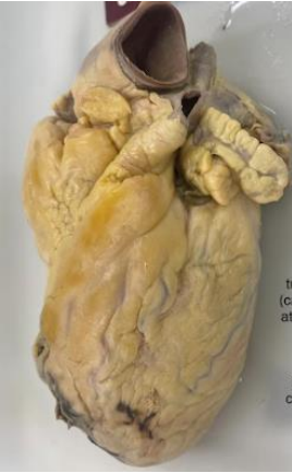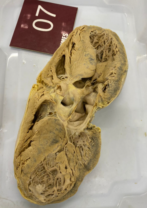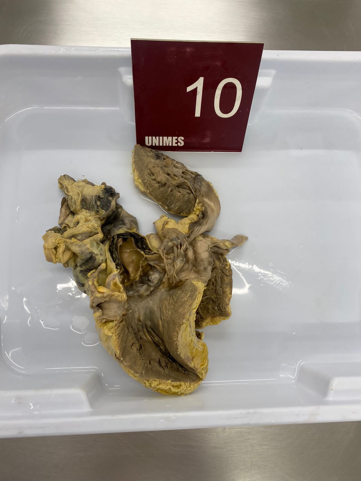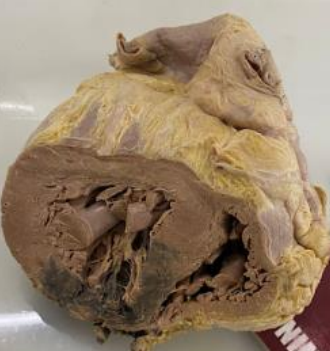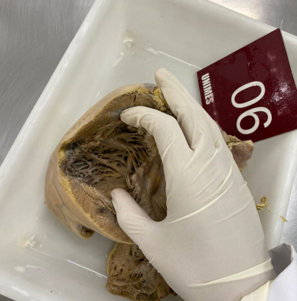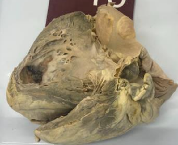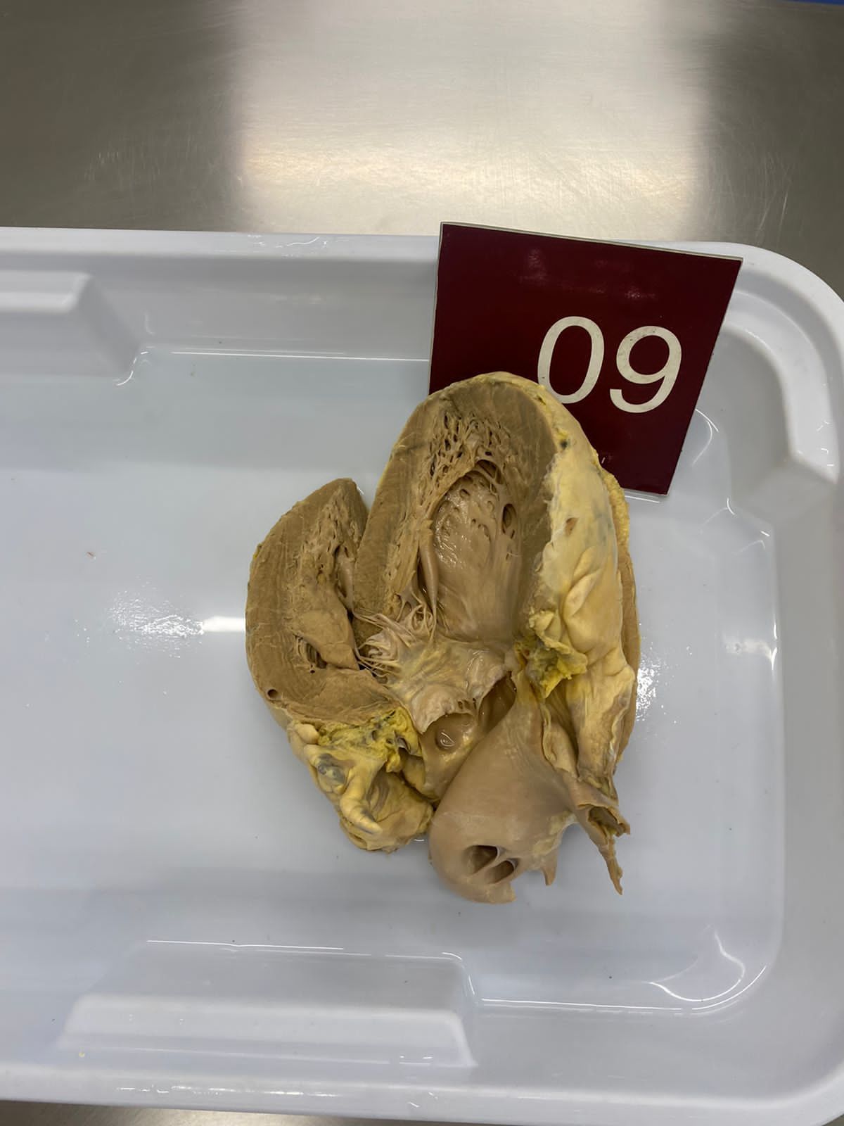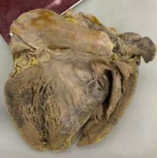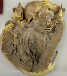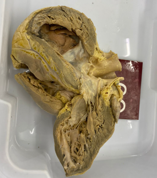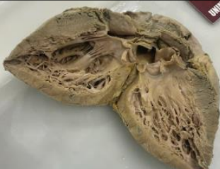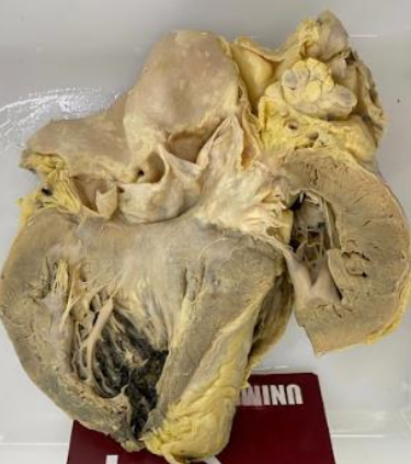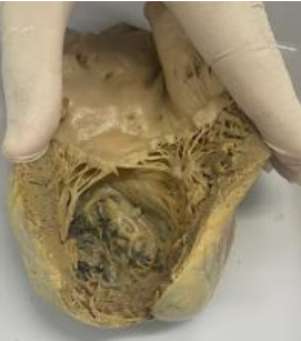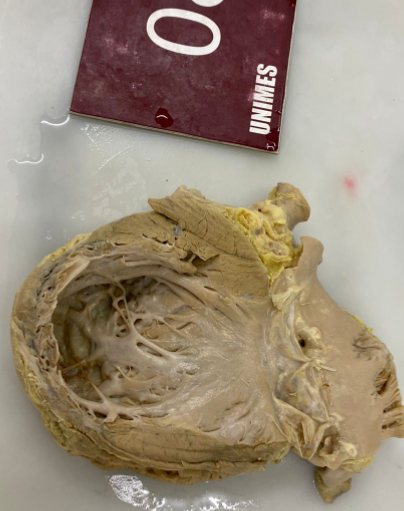 2. **Descrição Patológica: Coração que apresenta átrio esquerdo dilatado, a válvula mitral apresenta folhetos espessados, fusão de comissuras e fusionamento e encurtamento das fibras tendíneas em aspecto “boca de peixe”.**