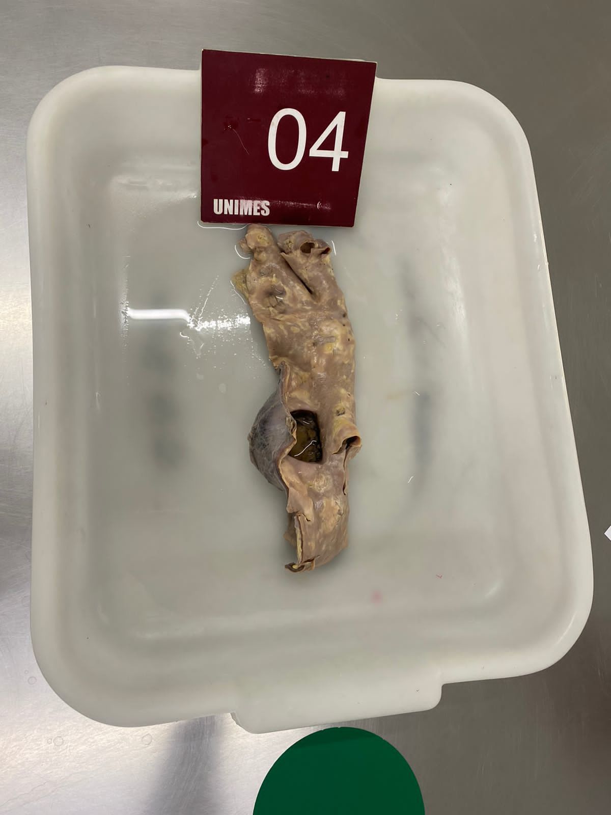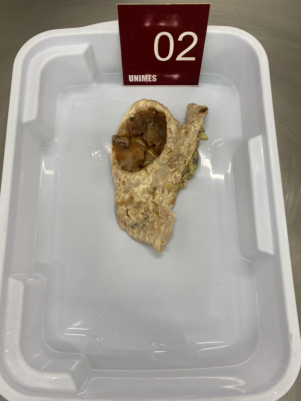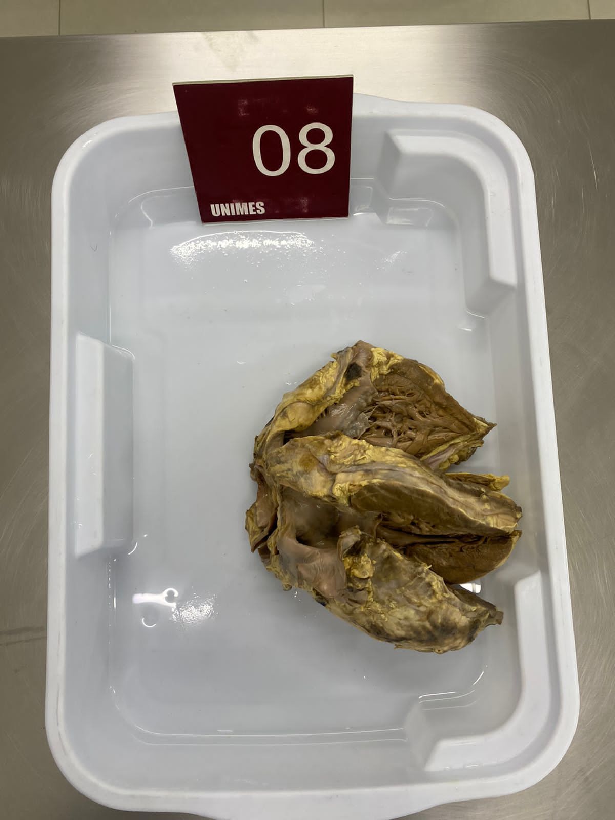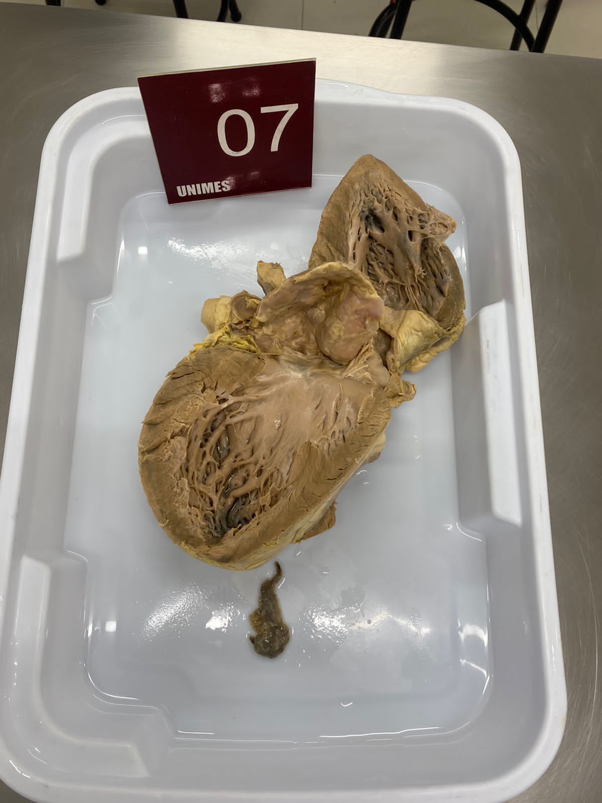 2. **Descrição Patológica: Coração que apresenta átrio esquerdo dilatado, a válvula mitral apresenta folhetos espessados, fusão de comissuras e fusionamento e encurtamento das fibras tendíneas em aspecto “boca de peixe”.**
