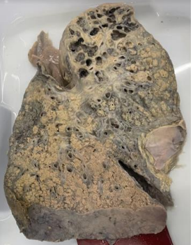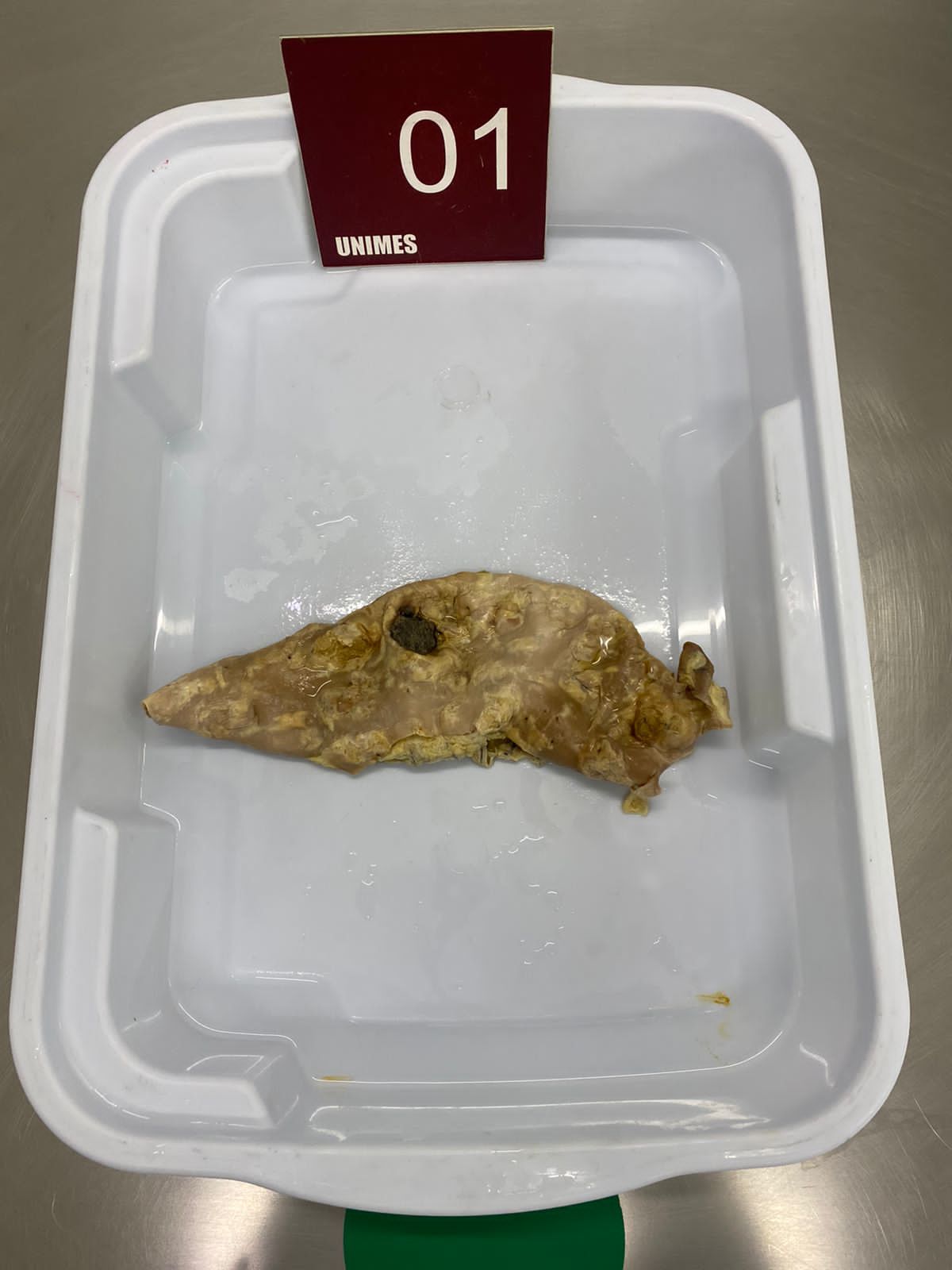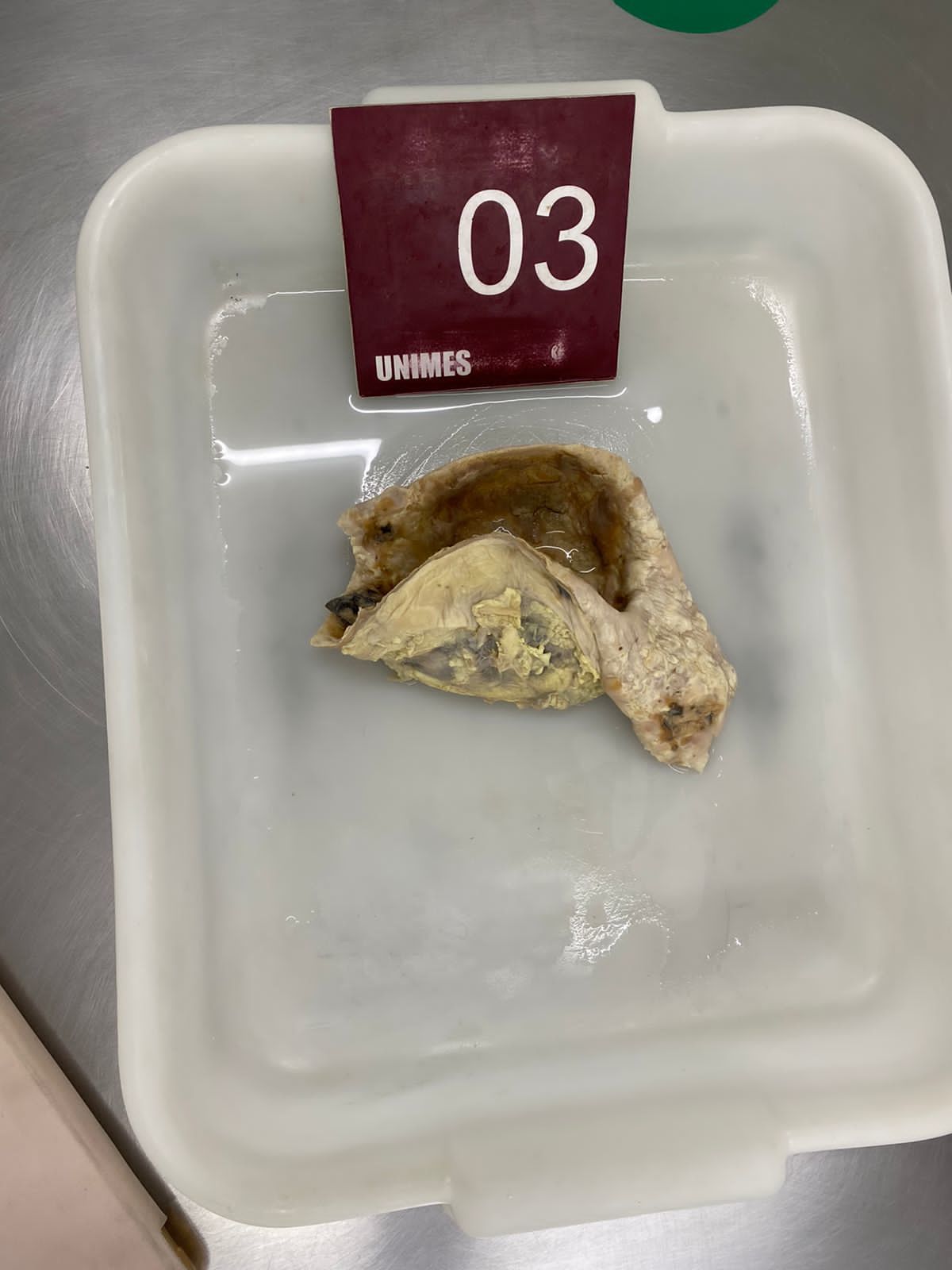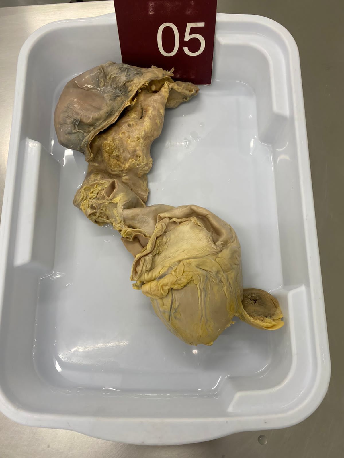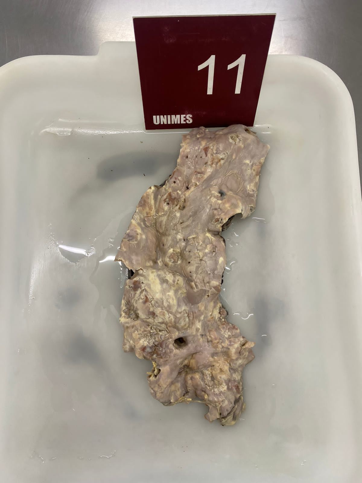 2. **Descrição Patológica: Coração que apresenta átrio esquerdo dilatado, a válvula mitral apresenta folhetos espessados, fusão de comissuras e fusionamento e encurtamento das fibras tendíneas em aspecto “boca de peixe”.**