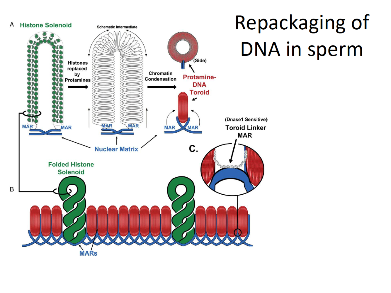 Sperm coil DNA around protamines, which makes the DNA form a toroid structure instead of solenoid structure. In this image, the DNA is wrapped around the protamine like a donut and then the protamines are stacked on top of one another. This increases the packing efficiency of the DNA superstructure (bottom image). There are histone solenoids interspersed thoughout for easier transcription.