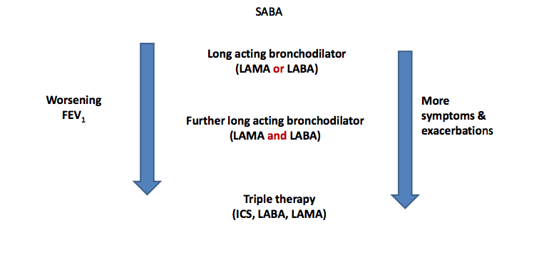How does the COPD inhaler treatment progress with severity, symptoms and exacerbation?