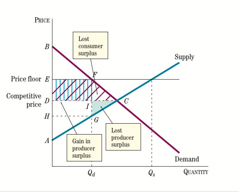 The price floor creates an excess supply of goods at the new higher price. Some producers gain because they are able to sell at a higher price than before. Others lose because they are no longer able to sell the good because the government doesn’t allow them to lower the price to attract buyers.