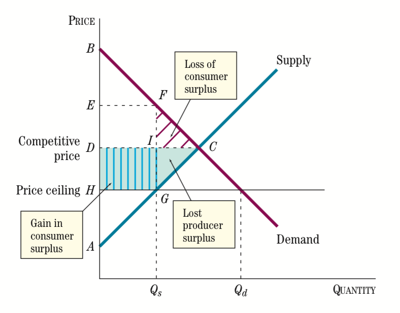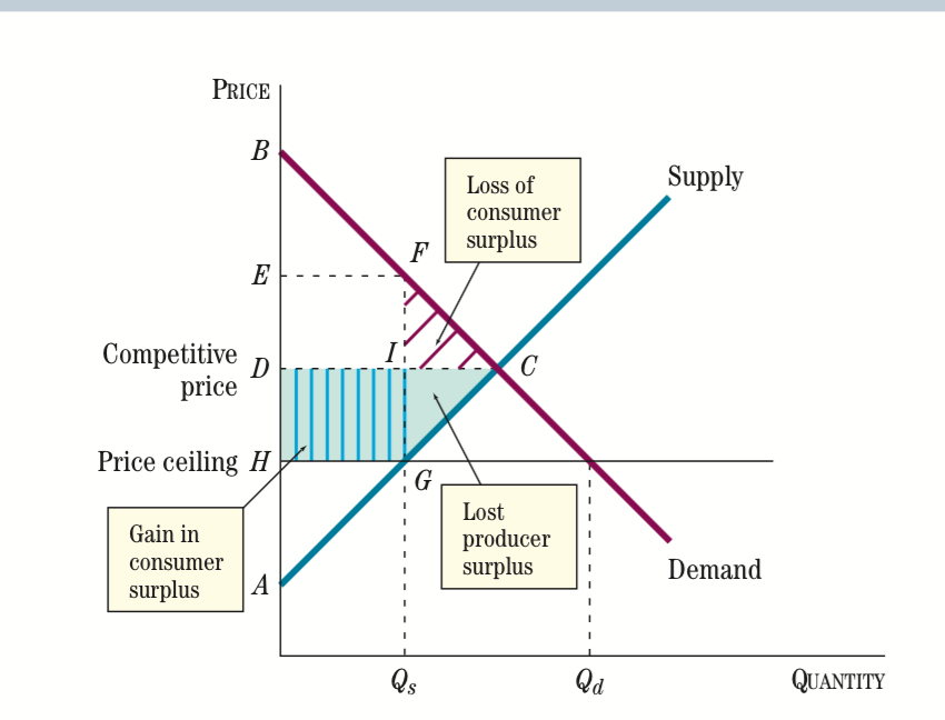 On the one hand, those consumers who are able to acquire the good at the lower price will obtain more consumer surplus. But because only a smaller quantity of goods is available for purchase, there will be a loss of consumer surplus for those who were previously able to buy the good but now cannot.