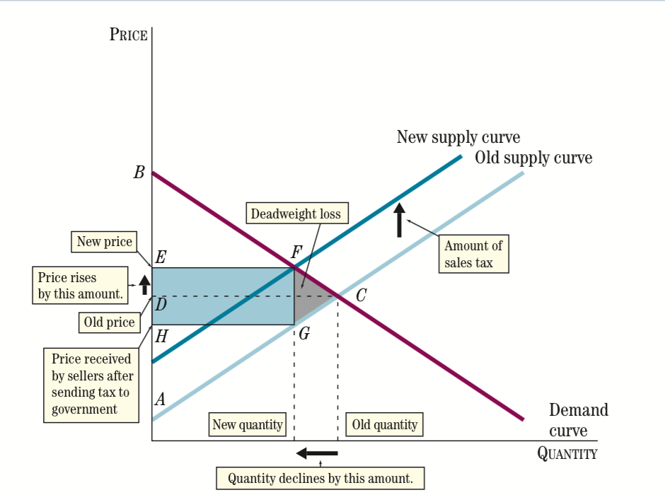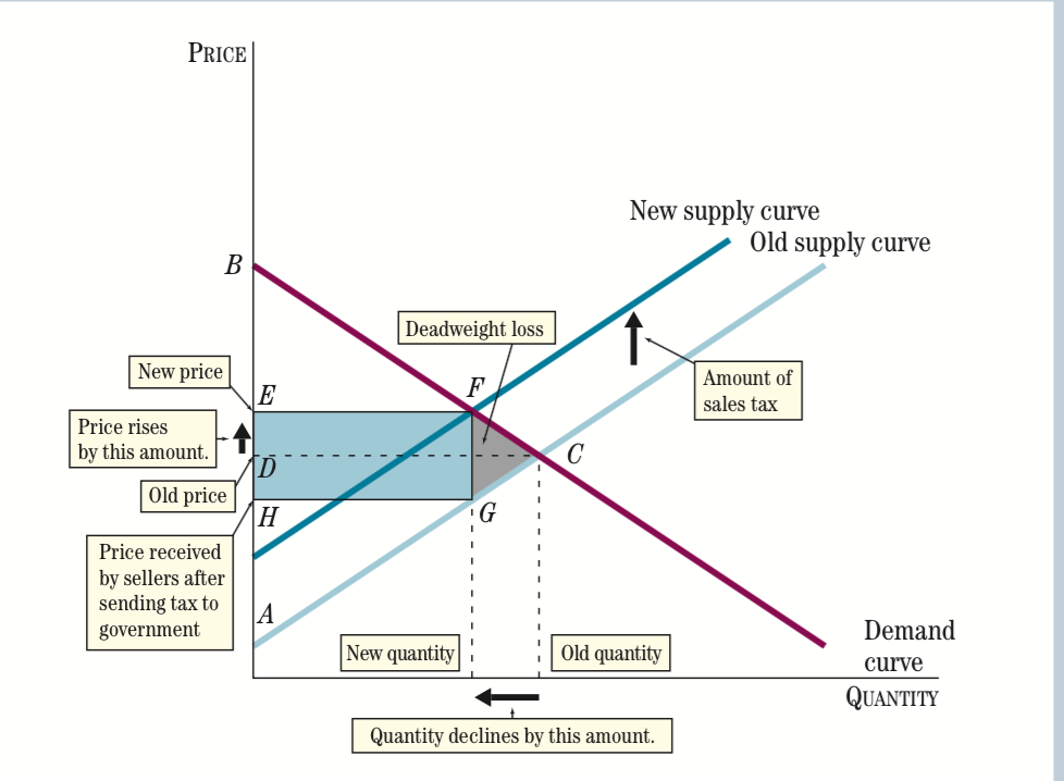 Consumer surplus is now given by the triangle BEF, while producer surplus is given by the triangle AGH (keep in mind that producers do not receive the new price; they only get the new price less the tax).