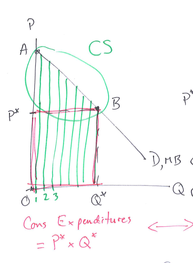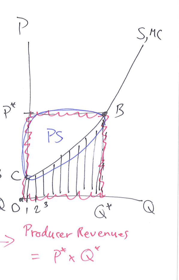 the producer surplus for all producers is the area above the supply curve and below the market price line, and that the consumer surplus for all consumers is the area below the demand curve and above the market price line
