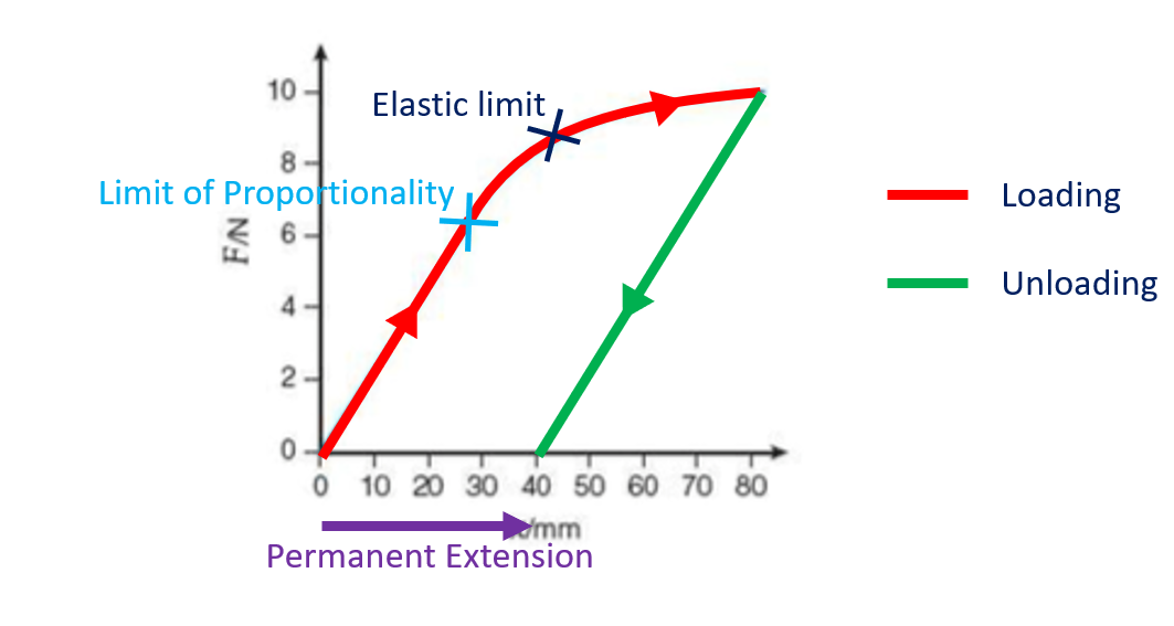 The elastic limit is the point at which it doesn’t return to its original length when unloaded.