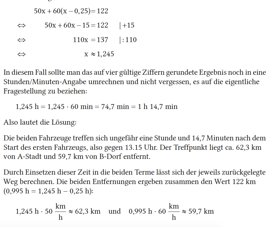 In diesem Fall ist es jedoch übersichtlicher, sich mit der Definition der Variablen auf den Beginn des ganzen Vorgangs (um 12.00 Uhr) zu beziehen und die Fahrzeit des zuerst gestarteten Fahrzeugs zu bestimmen. Daraus folgt dann die Fahrzeit des zweiten Fahrzeugs durch Subtraktion des Vorsprungs von einer Viertelstunde.