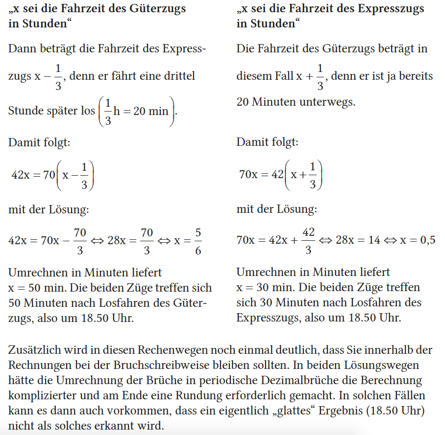 Da der Ort, an dem sich die beiden Züge befinden, von der jeweils verstrichenen Fahrzeit abhängt, wird man wieder eine dieser Fahrzeiten als Variable verwenden. Auch hier gibt es zwei Möglichkeiten: Die kleinere Fahrzeit ist die des Expresszuges und die größere die des Güterzugs: