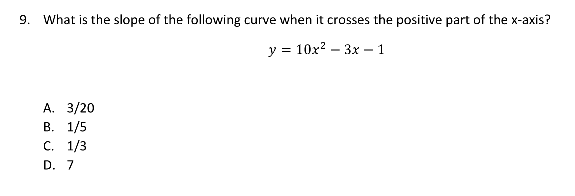 What is most nearly the slop of the line tangent to the parabola y = 12x2 + 3 at a point where x = 5?