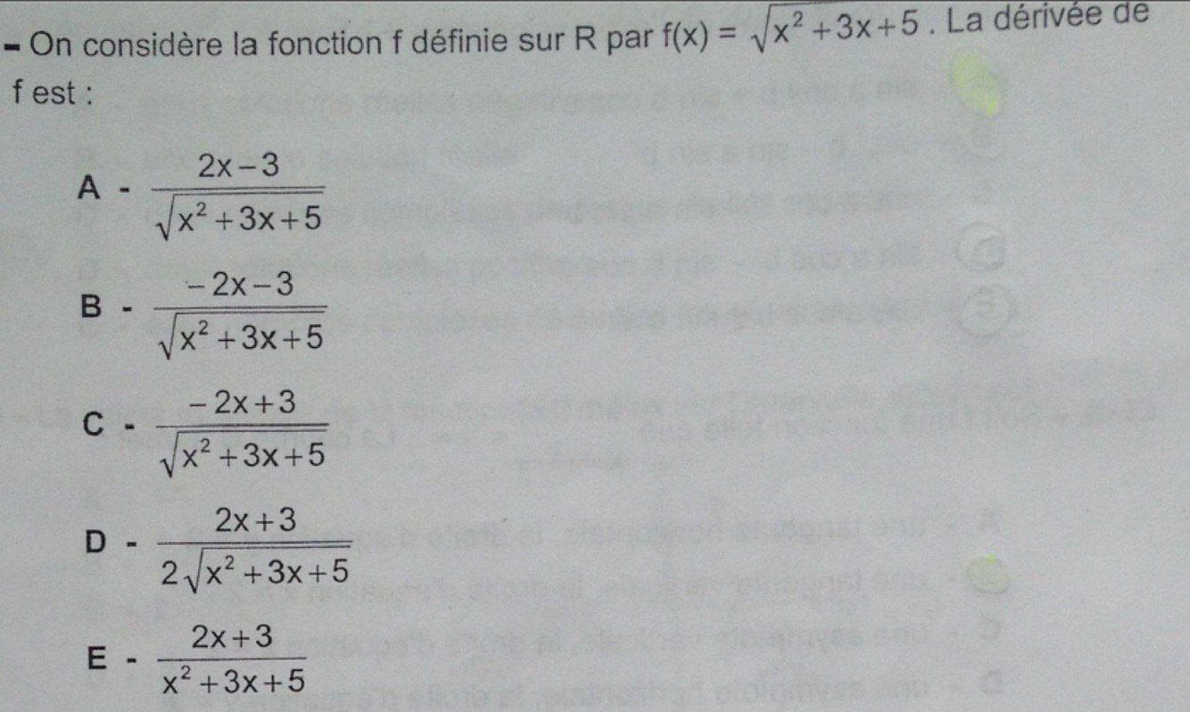 Donc, la dérivée de la fonction f(x) = √(x² + 3x + 5) est f’(x) = (2x + 3) / (2√(x² + 3x + 5)).