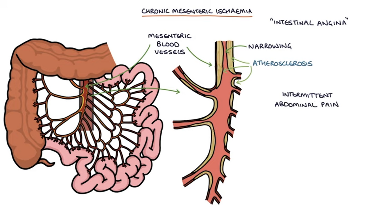 Causes intermittent abdominal pain when blood supply unable to meet demand