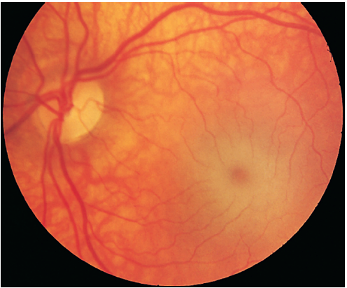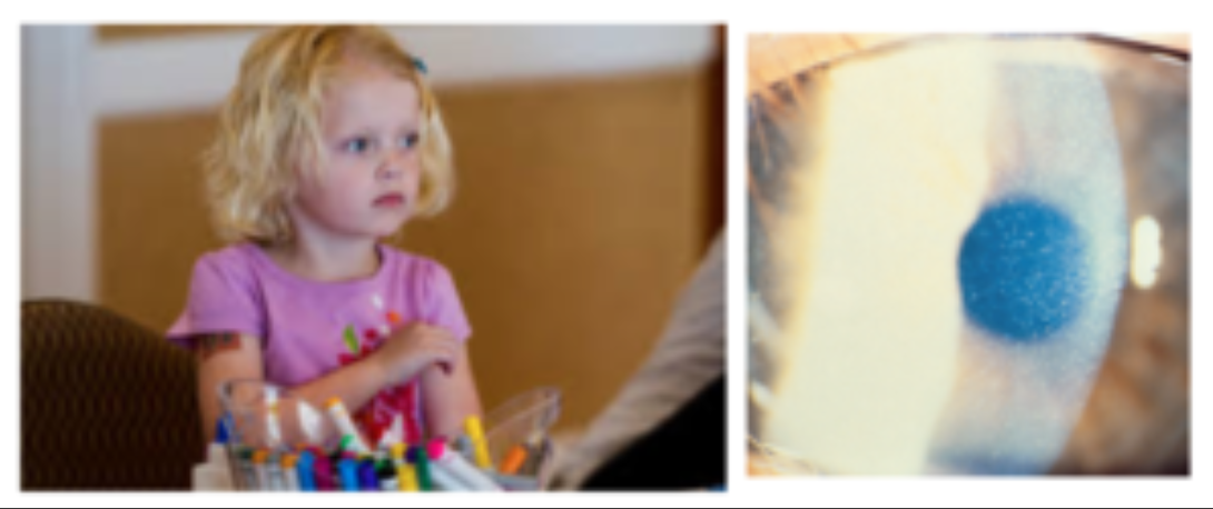A child with blonde hair much lighter than her family members is noted to have crystals on her optometry examination.