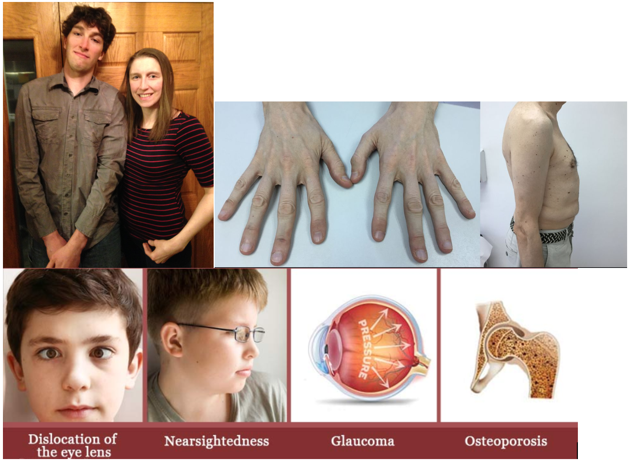 Clinical Features: ectopia lentis, myopia, osteoporosis, kyphoscoliosis, skeletal dysplasia, high palate, long fingers (Marfanoid), developmental delay, psychiatric issues, thrombosis (arterial and venous), fair, thin skin, myopathy, peripheral neuropathy