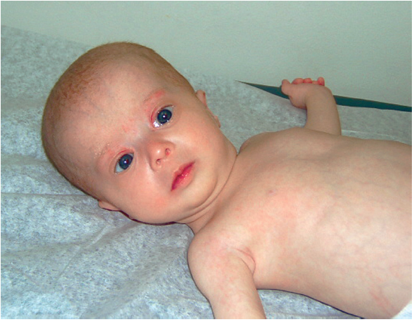 Clinical Features: Facial features (high forehead, upslanting palpebral fissures, hypoplastic supraorbital ridges, epicanthal folds), severe weakness and hypotonia, neonatal seizures, eye abnormalities, jaundice