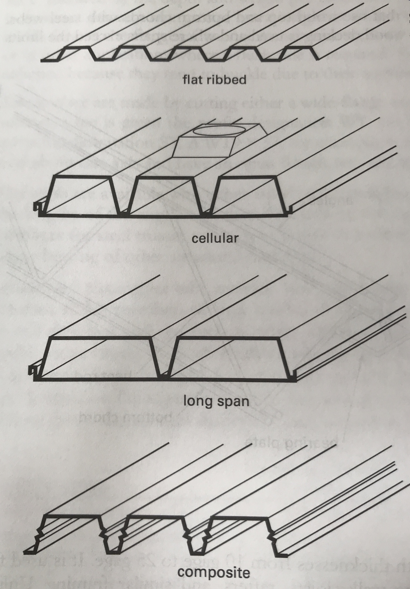 Most often steel, sometimes aluminum; composites ats structurally with concrete infill; cellular allows raceways