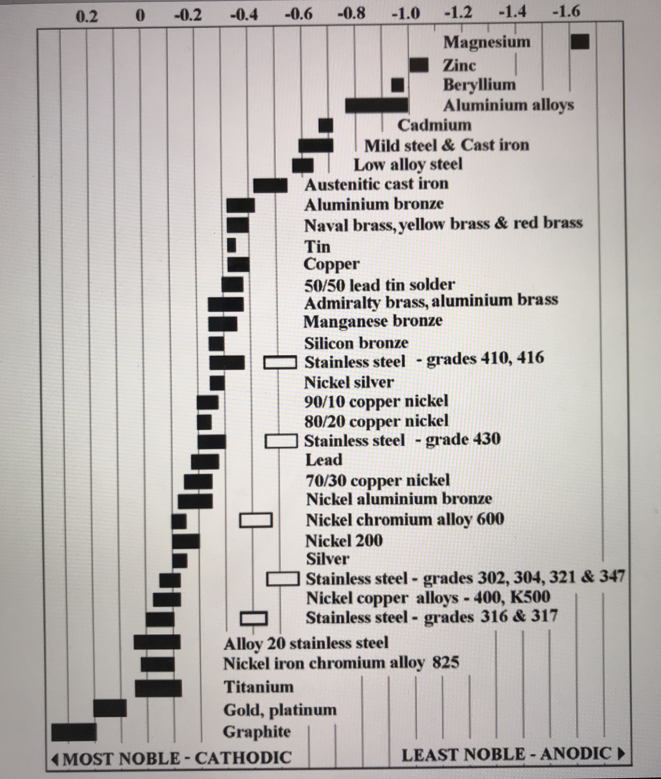 Least reactive: Brass, Bronze, Stainless Steel (passive)