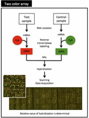 Briefly describe the two colour array method used to produce a gene expression microarray?